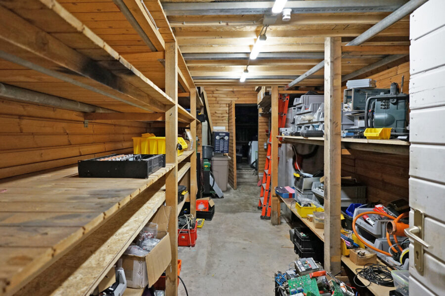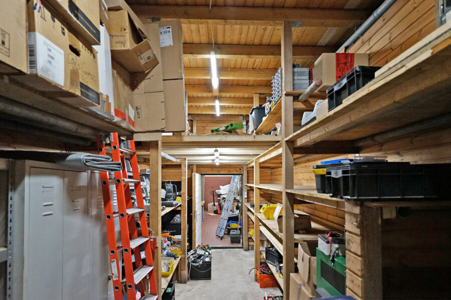 Daneben befindet sich eine weitere Lagerfläche mit Regalen auf zwei Ebenen, die zusätzlichen Stauraum bietet.