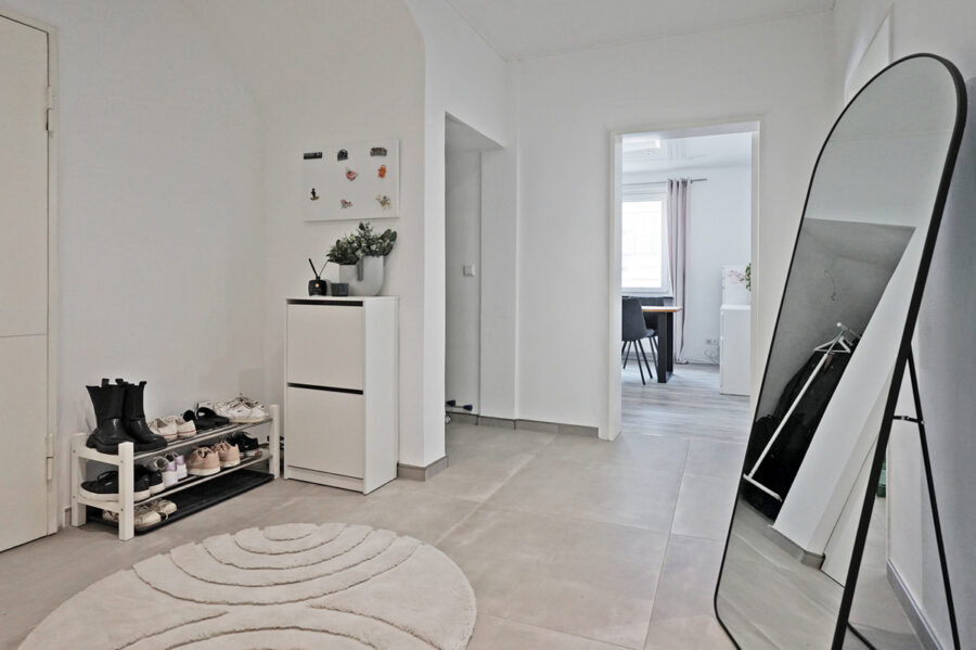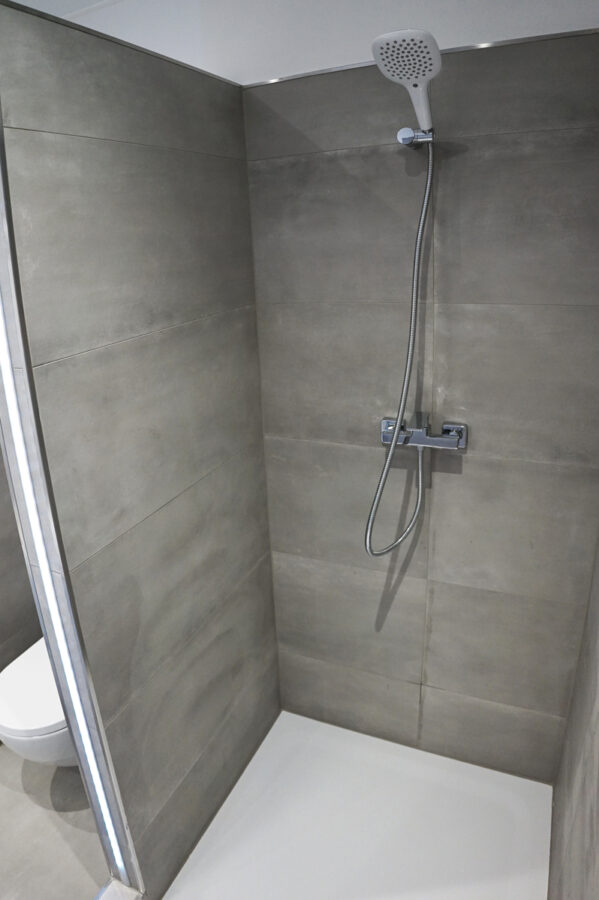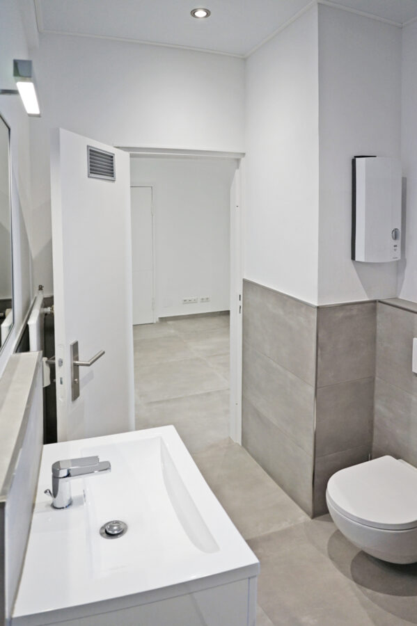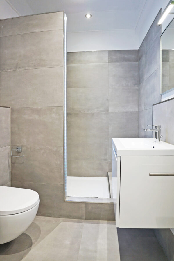 • Das Badezimmer ist mit einer bodengleichen Dusche, einem modernen Waschbecken inkl. Unterschrank, ein Hänge-WC sowie einem Handtuchwärmer ausgestattet.
